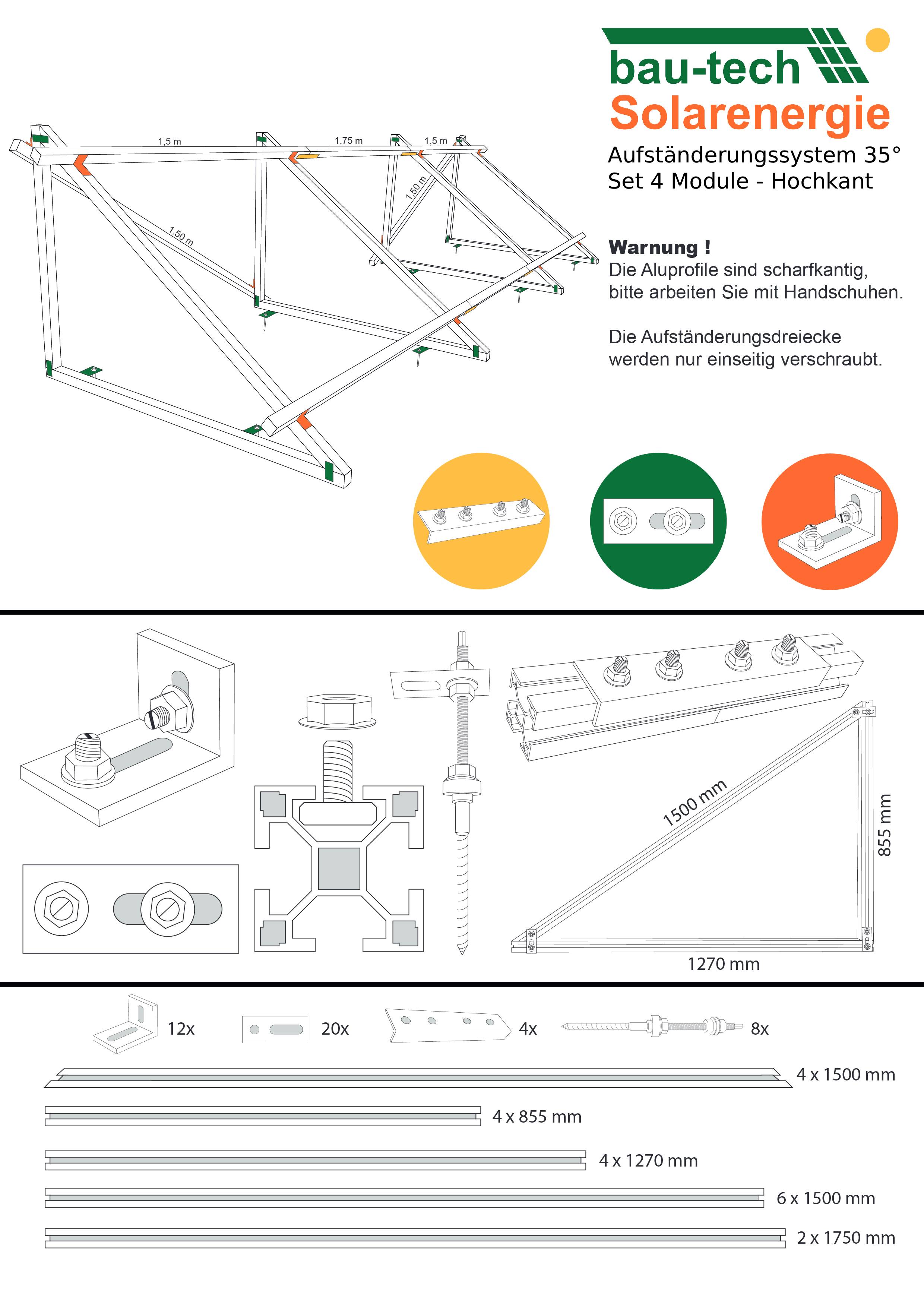 Aufständerungssystem 35° für Solarmodule – Hochkant – Set für 4 Module